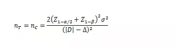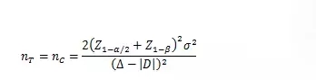 以下公式中,nT、nC分別為試驗組和對照組的樣本量;Z1-α/2、Z1-β為標準正態分布的分數位,當α=0.05時,Z1-α/2=1.96,當β=0.2時,Z1-β=0.842;(Z1-α/2+Z1-β)2=7.85